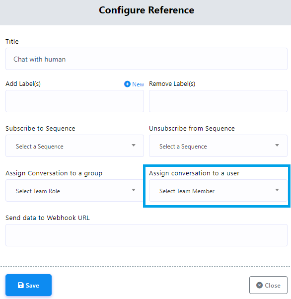 - If needed, you can assign a conversation to a specific user by selecting `Start Bot Flow`> `Assign Conversation To A User`. This assigns an agent to the conversation who will communicate with the user when `Chat With Human` is clicked by subscribers.