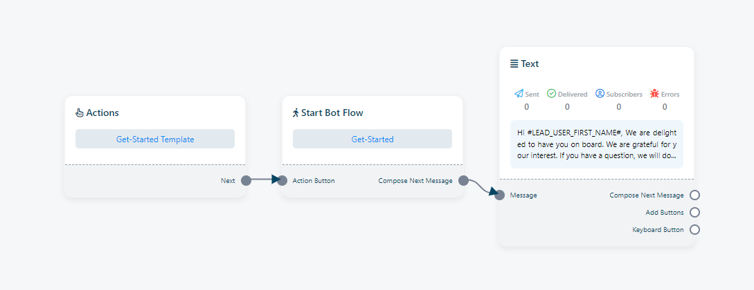 Get Started: The `Get Started` feature is designed to initiate a bot flow without requiring specific keywords. Within Telegram, there is a `Start` button, and clicking on it triggers the Get Started bot. Users have the flexibility to customize this Get Started bot.