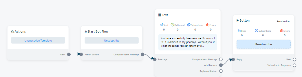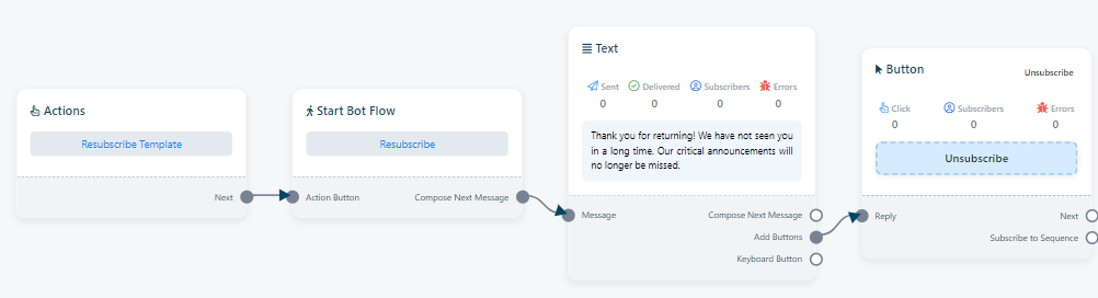 Re-subscribe: `Re-subscribe` refers to the process in which a user who had previously unsubscribed from receiving messages or notifications from the bot decides to opt back in or resume their interaction with the bot. This feature plays a significant role in sustaining user engagement and affords users the flexibility to re-engage with the chatbot should they have a change of heart.
