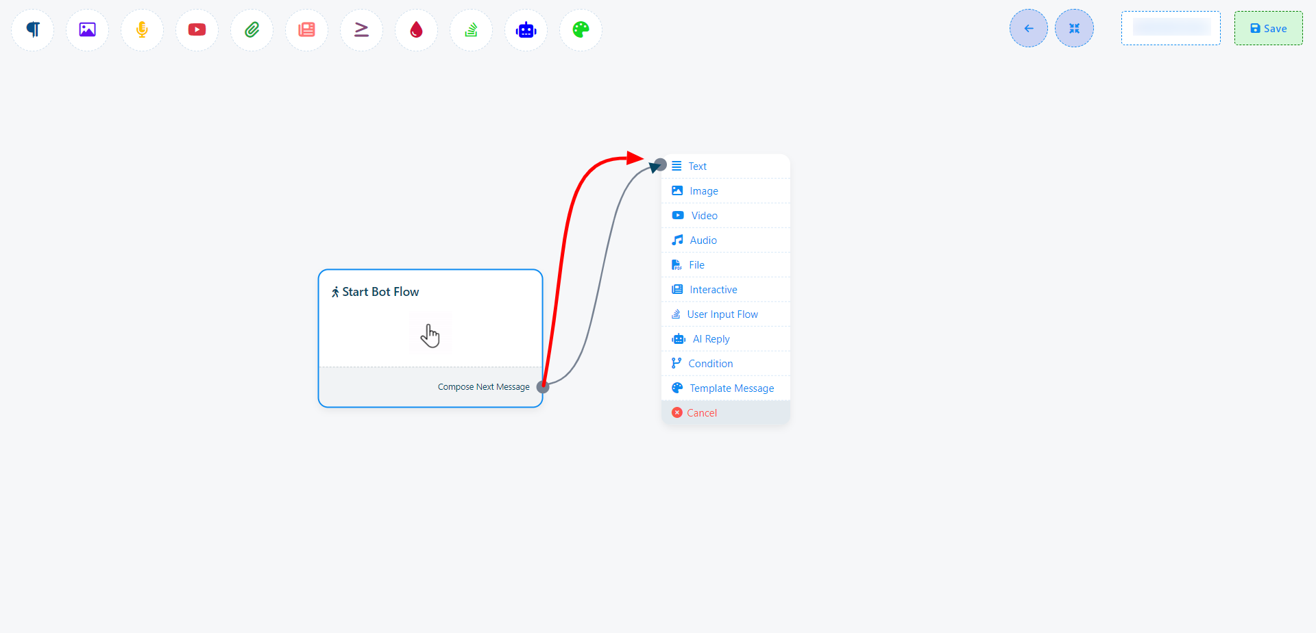 Once you`ve completed the `Start Bot Flow` setup, you`ll encounter a sockets: `Compose Next Message`, These sockets allow you to add various components and configure them.